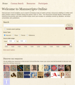Manuscripts Online is a database that allows users to search a wide array of digitized primary sources in Britain, written from 1000-1500 CE. The resources include literary manuscripts, historical documents, and early printed books from websites owned by libraries, archives, and universities – including the METS corpus. Clicking on search results will redirect users to the full-text content on the resource’s original website. Users can search by various types of keywords, include Middle English characters in their keyword searches, see variant spellings of their search terms, filter by various categories, make comments, and locate search terms on Google Maps if they have geographical significance.